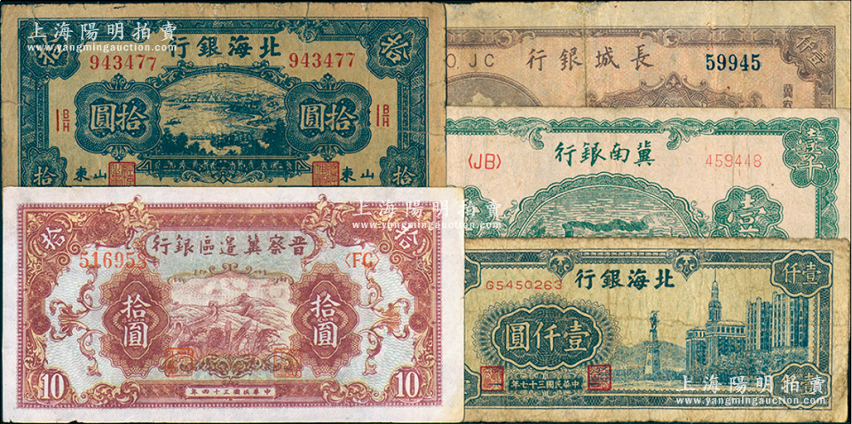 区票5种,详分:冀南银行1942年火车图壹千圆;晋察冀边区银行1945年长城图拾圆;北海银行1945年蓝海滨公路图拾圆,1948年大厦图壹仟圆;长城银行1948年壹仟圆;七至八五成新,敬请预览