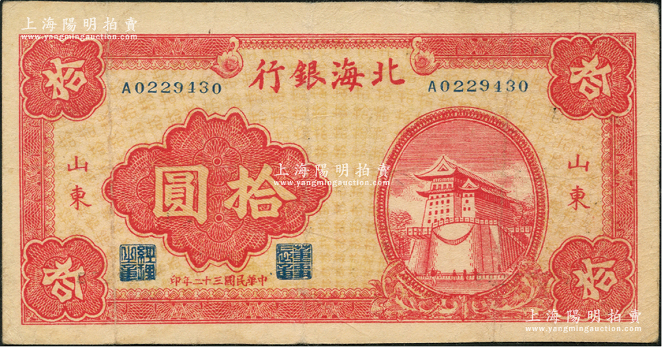 民国三十二年(1943年)北海银行红色前门图拾圆,山东地名;资深藏家出品,八成新