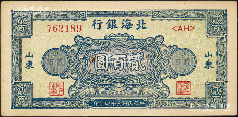 民国三十四年(1945年)北海银行蓝色花纹图贰百圆,山东地名;资深藏家出品,未折九五成新