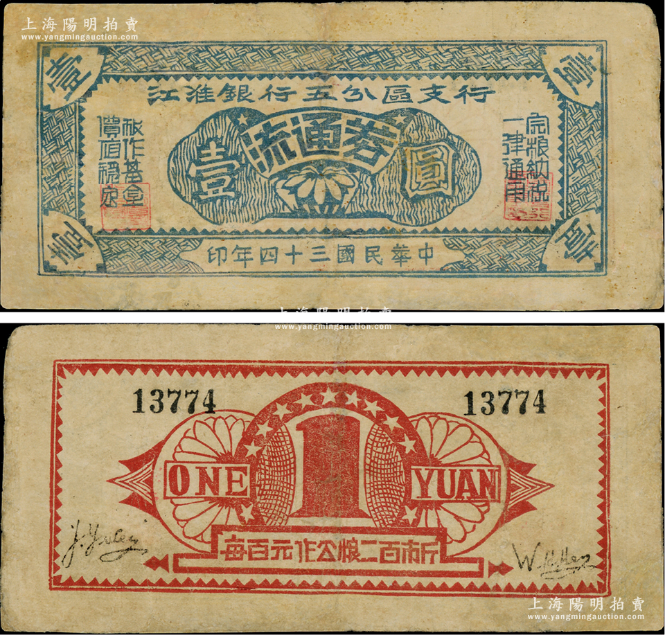 民国三十四年(1945年)江淮银行五分区支行流通券壹圆,此券以粮食作为发行基金,背面红色印刷,且印有“每百元作公粮二百市斤”字样;新四军抗币之罕见品,有修补,近八成新