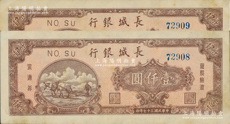 民国三十七年(1948年)长城银行壹仟圆共2枚连号,前辈藏家出品,九成新