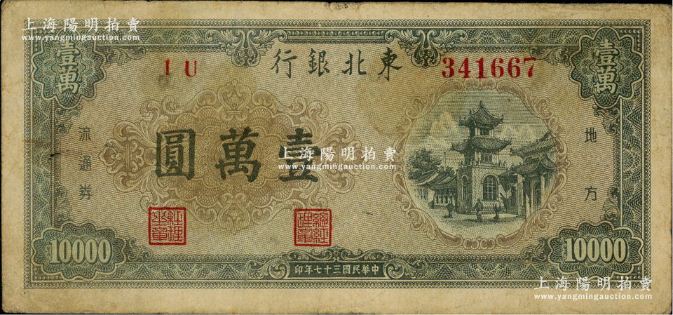 民国三十七年(1948年)东北银行地方流通券壹万圆,棕色底纹版,原票七成新