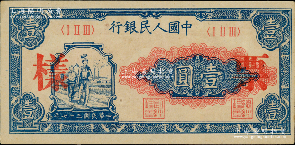 第一版人民币“工农图”壹圆单张票样,正背面合印,九八成新