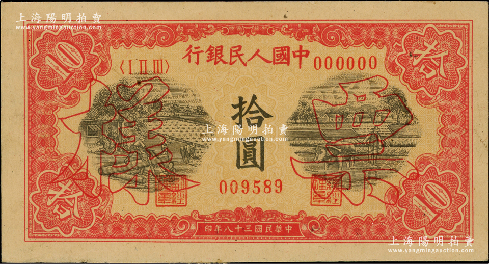 第一版人民币“锯木与耕地图”拾圆双张票样,正背共2枚,九五成新