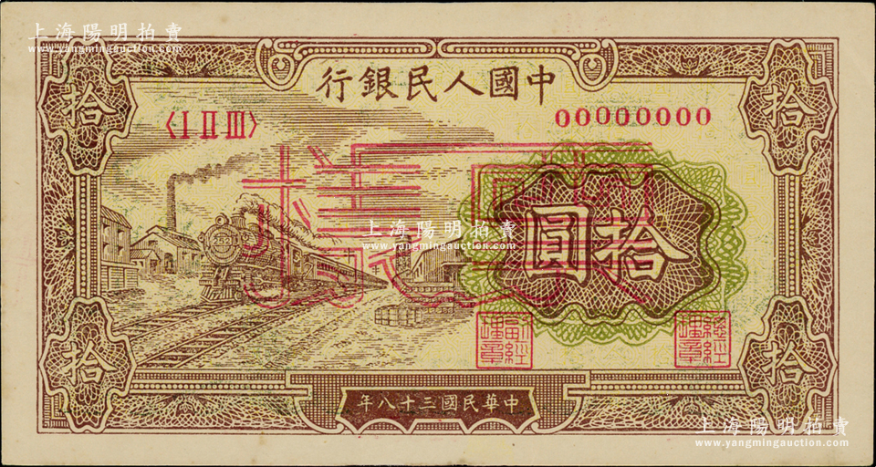 第一版人民币“黄火车站”拾圆单张票样,正背面合印,中未折九五成新
