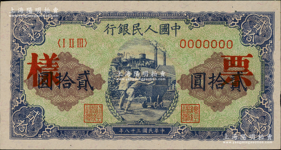 第一版人民币“推煤车”贰拾圆单张票样,正背面合印,未折九五成新