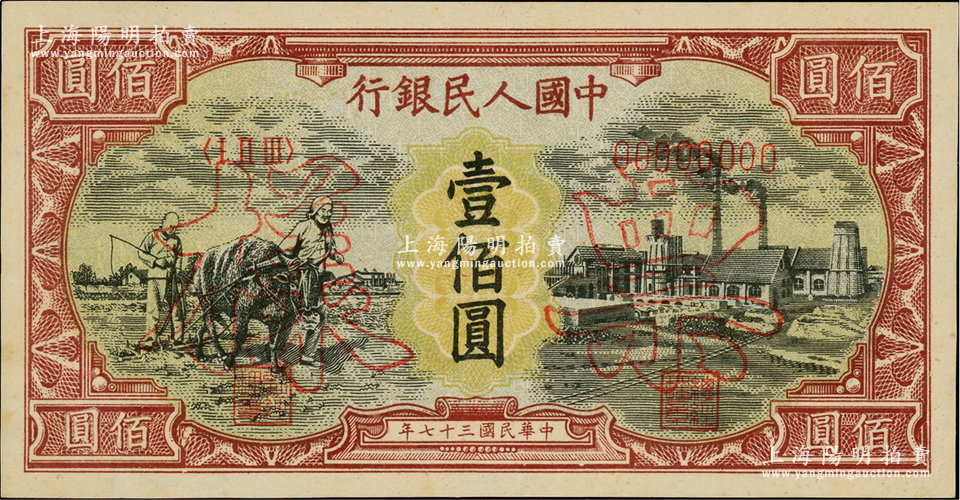 第一版人民币“耕地与工厂”壹佰圆单张票样,正背面合印,五星水印,九八成新