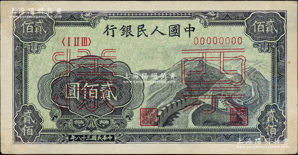 第一版人民币“长城图”贰佰圆双张票样,正背共2枚,有修补,未折八五成新