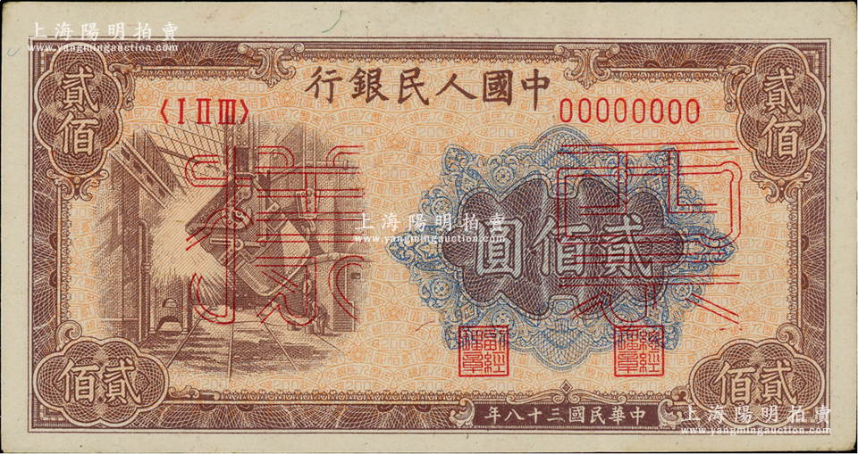 第一版人民币“炼钢图”贰佰圆单张票样,正背面合印,九成新