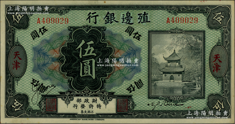 殖边银行无年份美钞版伍圆,票上有描改痕迹,少见,八五成新