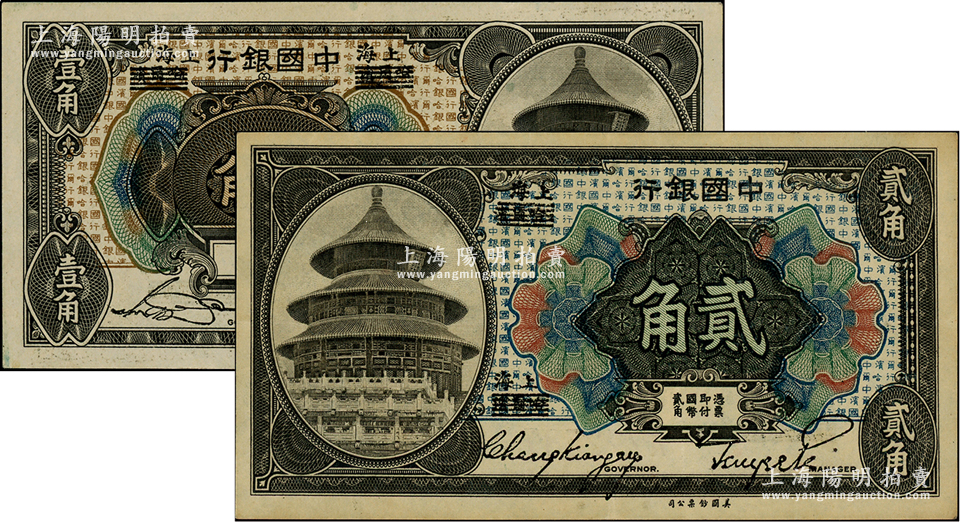 1918年中国银行壹角(宋汉章·贝祖诒签名)、贰角(张嘉璈·贝祖诒签名)共2枚不同,哈尔滨改上海地名;江南藏家出品,九五至九八成新