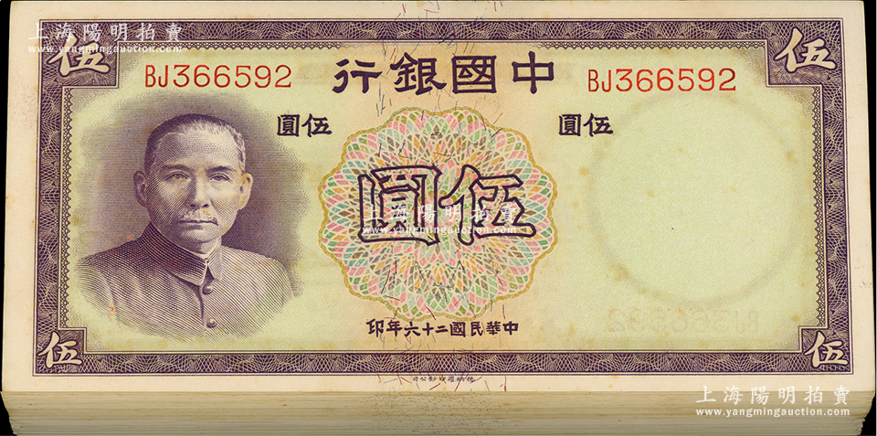 民国二十六年(1937年)中国银行德纳罗版伍圆共100枚,内含单字轨和双字轨;海外回流品,除个别有软折外,整体约九八至全新,敬请预览