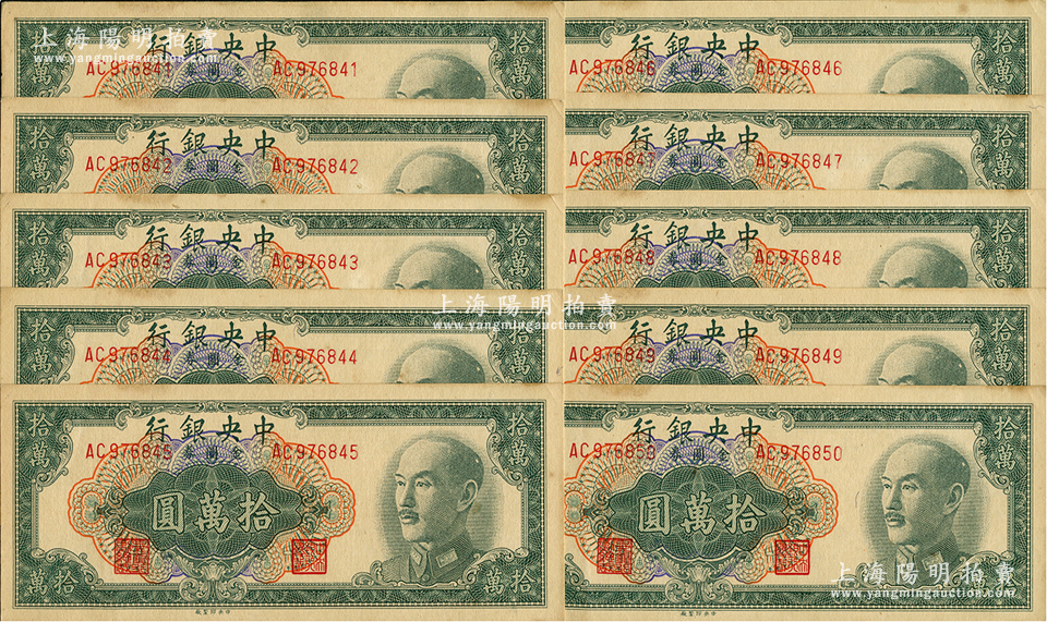 1949年中央银行金圆券中央厂拾万圆共10枚连号,未折九五成新