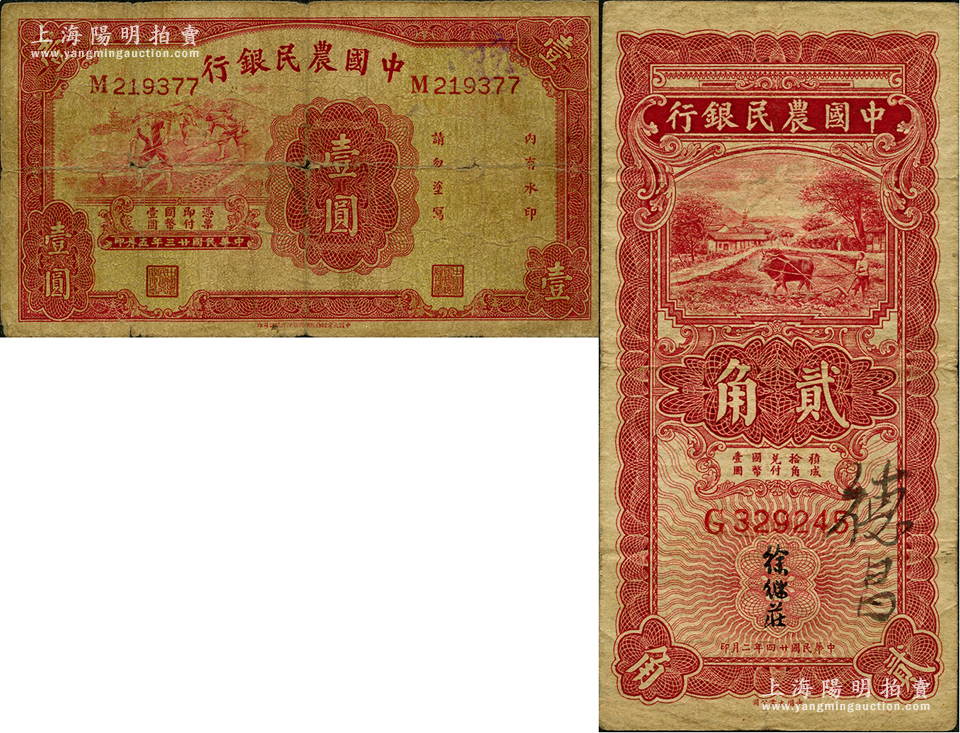 中国农民银行纸币2种,详分:1934年壹圆,无地名券;1935年第一版红色牛耕地贰角,徐继庄签名;原票七成新