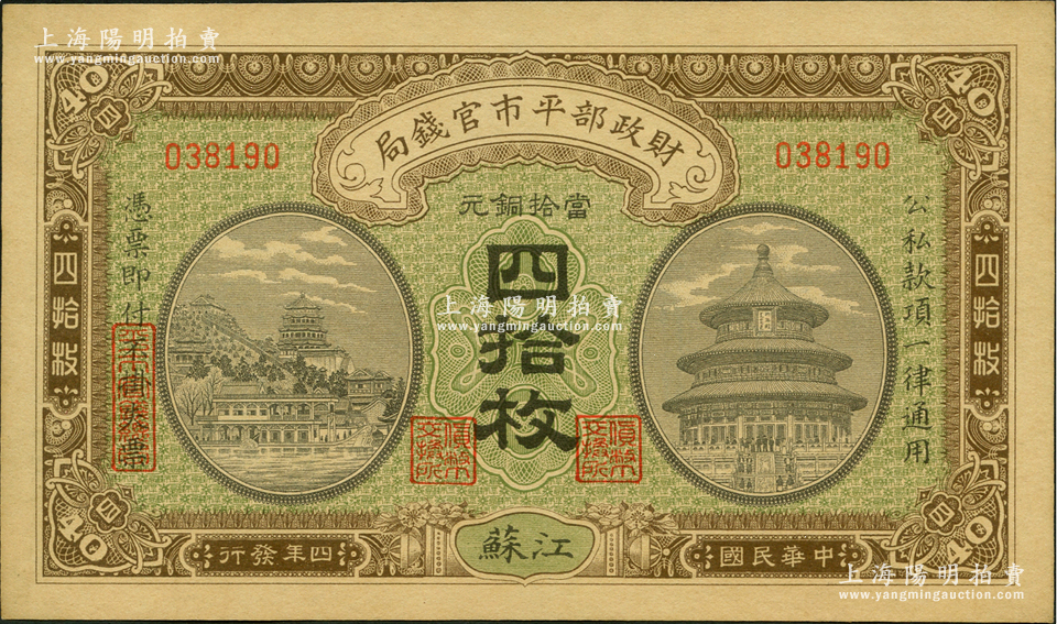民国四年(1915年)财政部平市官钱局当拾铜元四拾枚,江苏地名;前辈藏家出品,九五成新