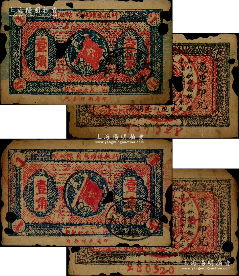 1933年闽浙赣省苏维埃银行壹角共2枚不同,其左右两侧分别为“红色骑缝章”和“蓝色骑缝章”版,其中“蓝色骑缝章”版存世颇为稀见,且两者背面下边号码亦有大小之分;图案清晰,唯惜有缺损,原票五至六成新,敬请预览