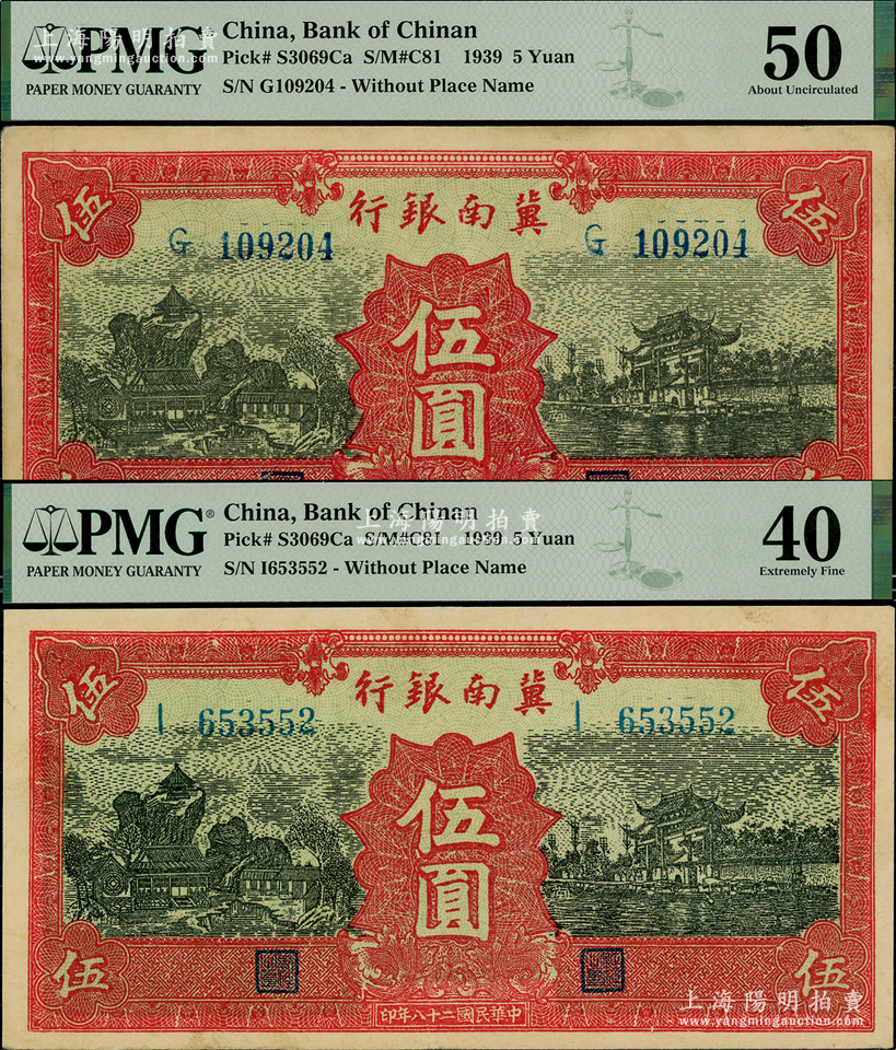 民国二十八年(1939年)冀南银行红色伍圆共2枚,均为无地名券,PMG 40 EF and 50 AU