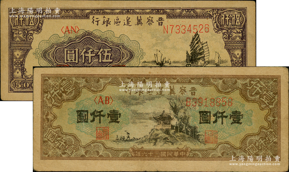 民国三十六年(1947年)晋察冀边区银行亭景图壹仟圆、帆船图伍仟圆共2枚不同,原票八成新