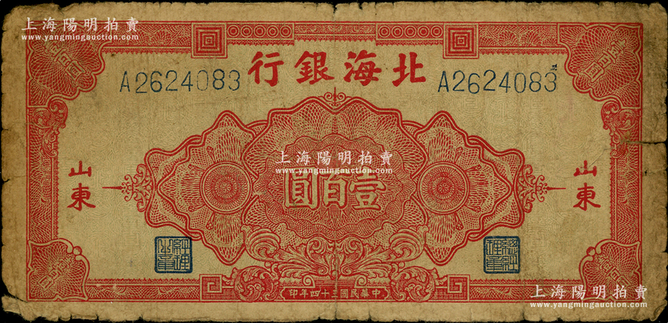 民国三十四年(1945年)北海银行红色花纹图壹百圆,山东地名,原票近七成新