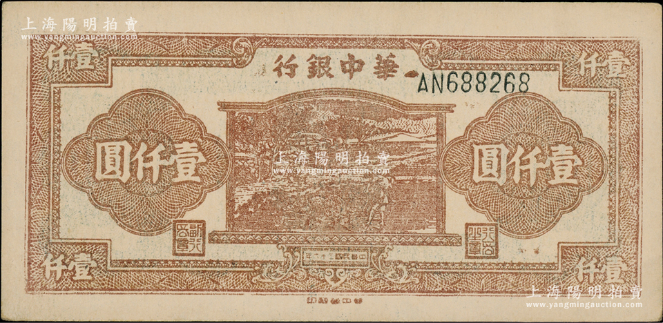 民国三十六年(1947年)华中银行棕色牛耕田图壹仟圆,源于江南藏家之遗存,原汁原味,九五成新