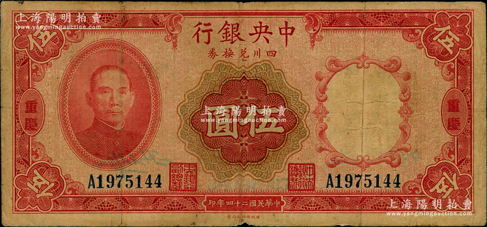 民国二十四年(1935年)中央银行四川兑换券伍圆,重庆地名;资深藏家出品,原票七五成新