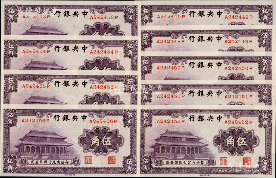 中央银行中华版大成殿伍角共9枚连号,前后字轨,资深藏家出品,全新