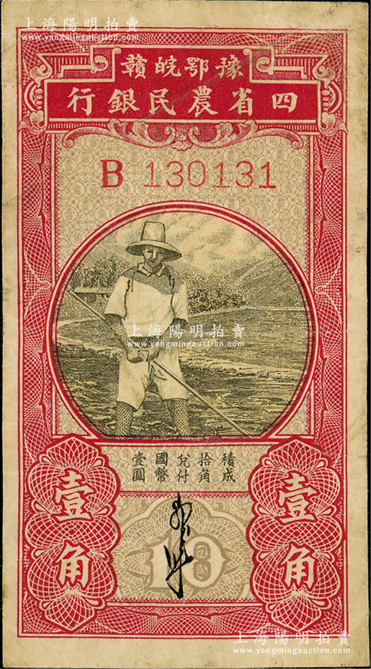 豫鄂皖赣四省农民银行(1933年)第一版黑色农夫图壹角,单字轨,郭外峰签名;资深藏家出品,原票七五成新