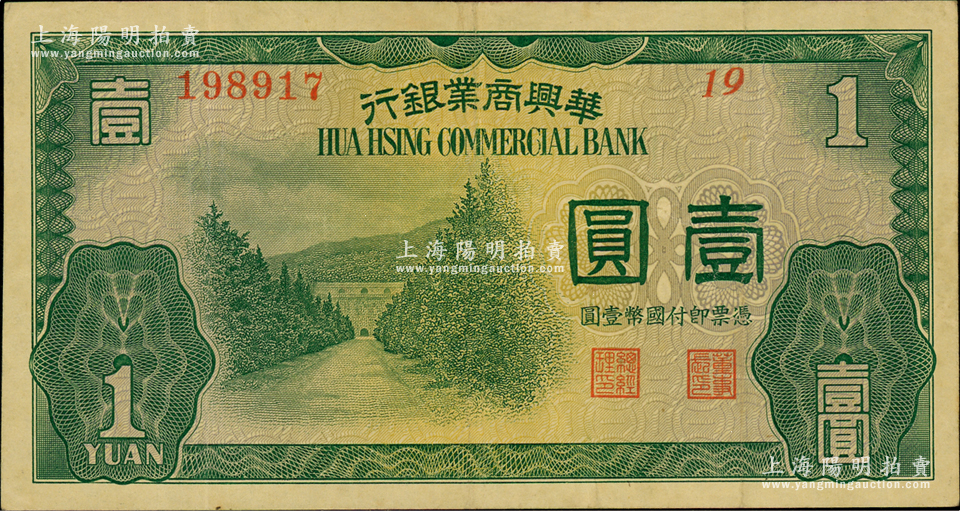 民国二十七年(1938年)华兴商业银行壹圆,上印南京明孝陵图;资深藏家出品,少见,原票八成新