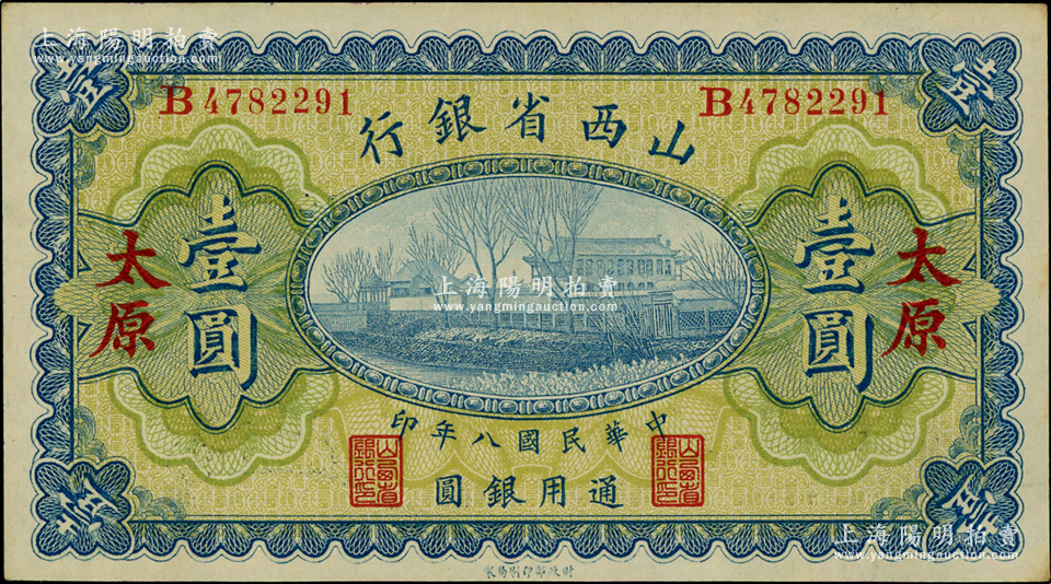 民国八年(1919年)山西省银行壹圆,太原地名,背为C. Y. Chia和Y. C. Hsü签名;资深藏家出品,上佳品相,原票未折九五成新