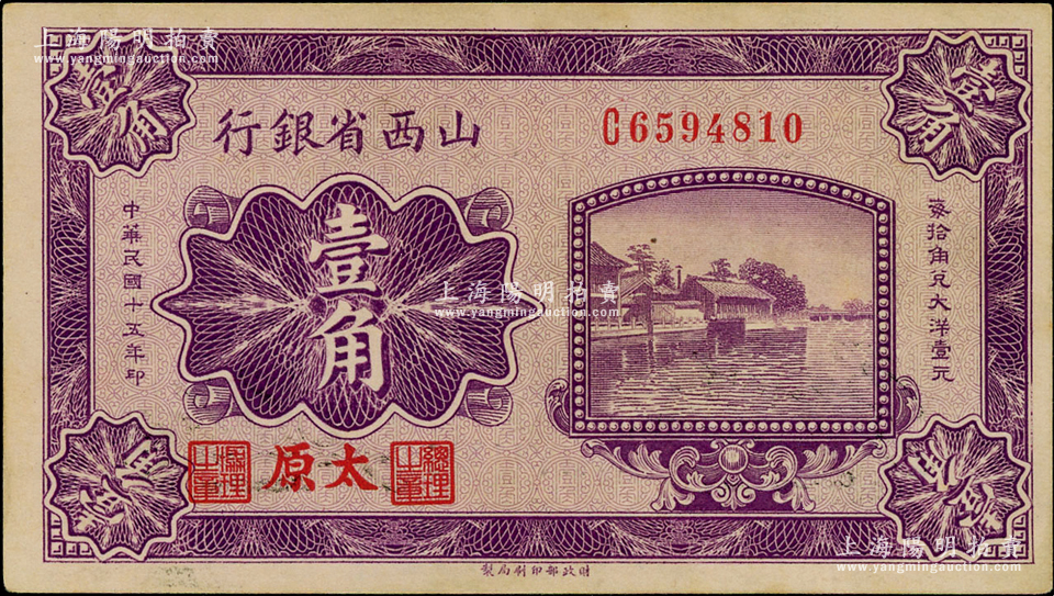 民国十五年(1926年)山西省银行壹角,太原地名;资深藏家出品,未折九成新