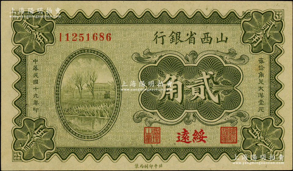 民国十九年(1930年)山西省银行贰角,绥远地名;资深藏家出品,一流品相,九五成新