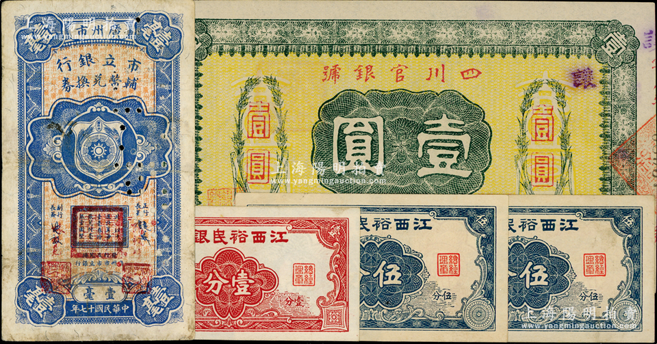 省钞5枚,详分:江西裕民银行壹分、伍分2枚,广州市市立银行1928年壹毫,四川官银号横式壹圆,背盖“成都总商会章”;资深藏家出品,七五至九五成新