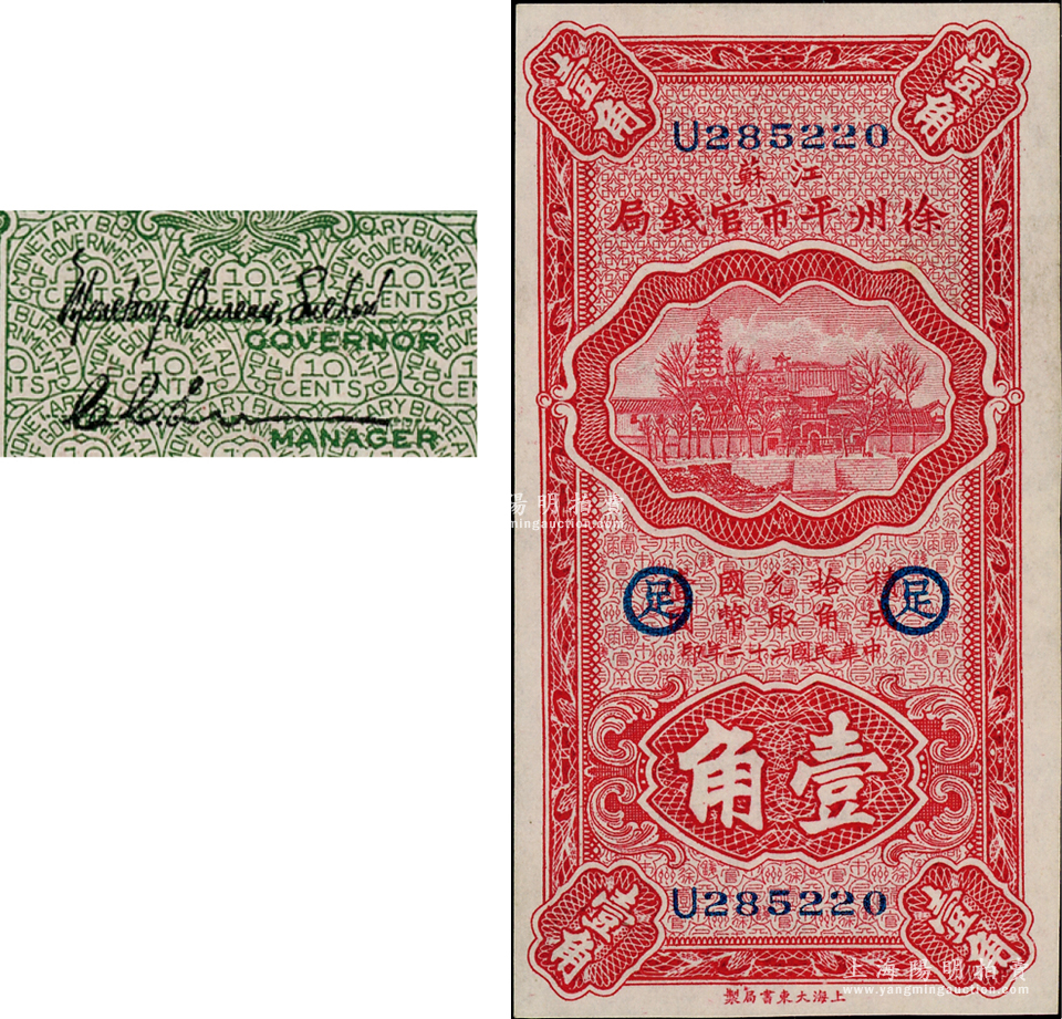 民国二十二年(1933年)江苏徐州平市官钱局壹角,第二版签名券,且加印领券“足”字样;资深藏家出品,一流品相,九八成新