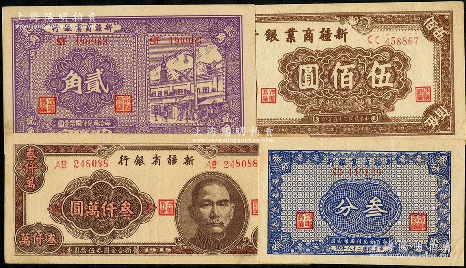 新疆省钞4种,详分:新疆商业银行1939年叁分、贰角,1946年伍佰圆;新疆省银行1949年叁仟万圆;资深藏家出品,品相甚佳,九至九五成全新,敬请重视