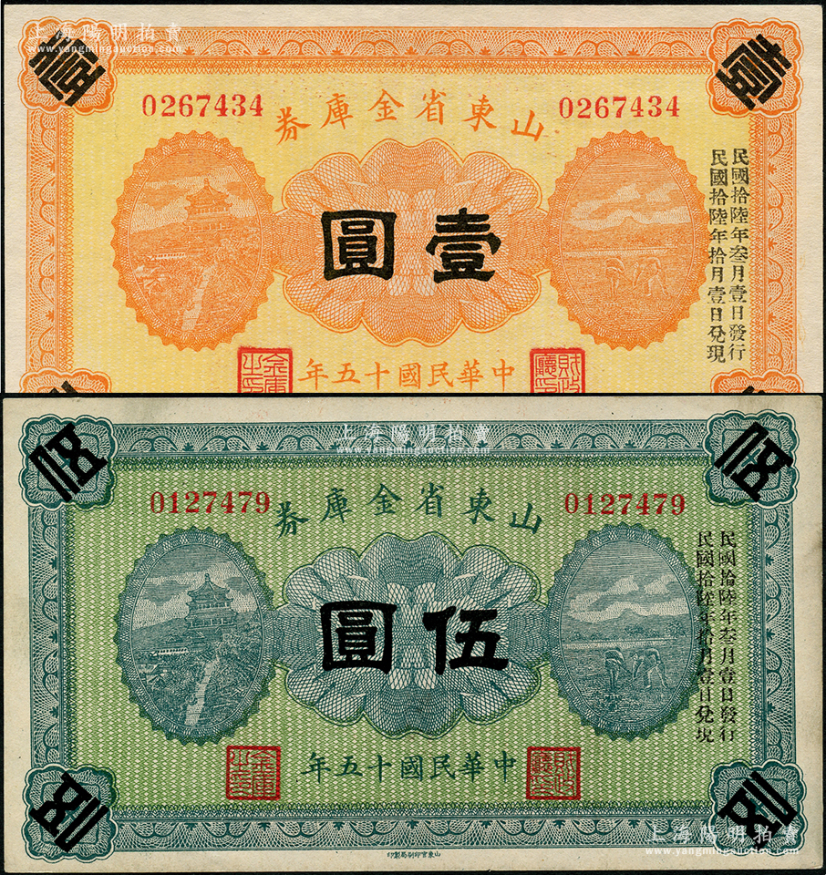 民国十五年(1926年)山东省金库券壹圆、伍圆共2枚不同,均加印“民国拾陆年叁月壹日发行,民国拾陆年拾月壹日兑现”,军阀张宗昌氏发行;资深藏家出品,九五至九八成新
