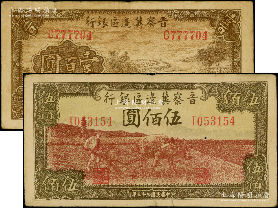 民国三十三年(1944年)晋察冀边区银行插秧图壹百圆、牛耕地图伍佰圆共2枚不同,均属少见品种;资深藏家出品,原票七五成新,敬请预览