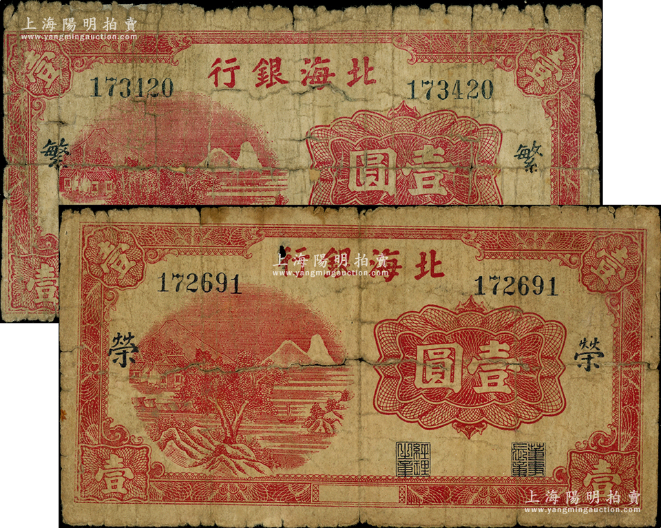 北海银行漏印年份版红色山水风景图壹圆共2枚不同,均属大号码券,分别加印“繁”、“荣”字,属早期发行券;资深藏家出品,少见,六成新,敬请预览
