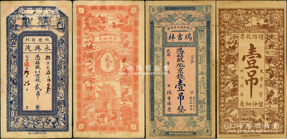 直隶民间钞票2种,详分:(河间)瑞吉祥京钱壹吊,上印双龙、双麒麟和八仙图;(饶阳)永兴茂1916年京钱贰吊,上印三星、八仙、五仙童;形制美观,八五成新