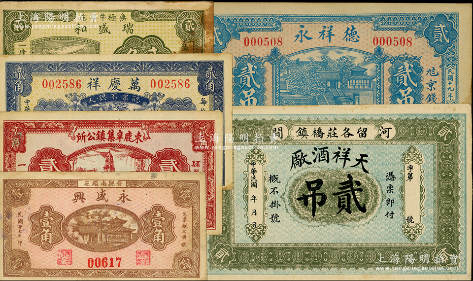 河北民间钞票6种,详分:(阜平)万庆祥1930年贰角;(故城)德祥永1930年贰吊;(河间)天祥酒厂贰吊;束鹿辛集镇公所1938年贰角;(晋县)永盛兴1938年壹角;(无极)瑞盛和1939年贰角;七五至九成新,敬请预览