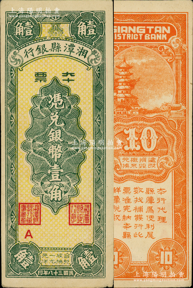 民国三十八年(1949年)湘潭县银行本票银币壹角,中未折九成新