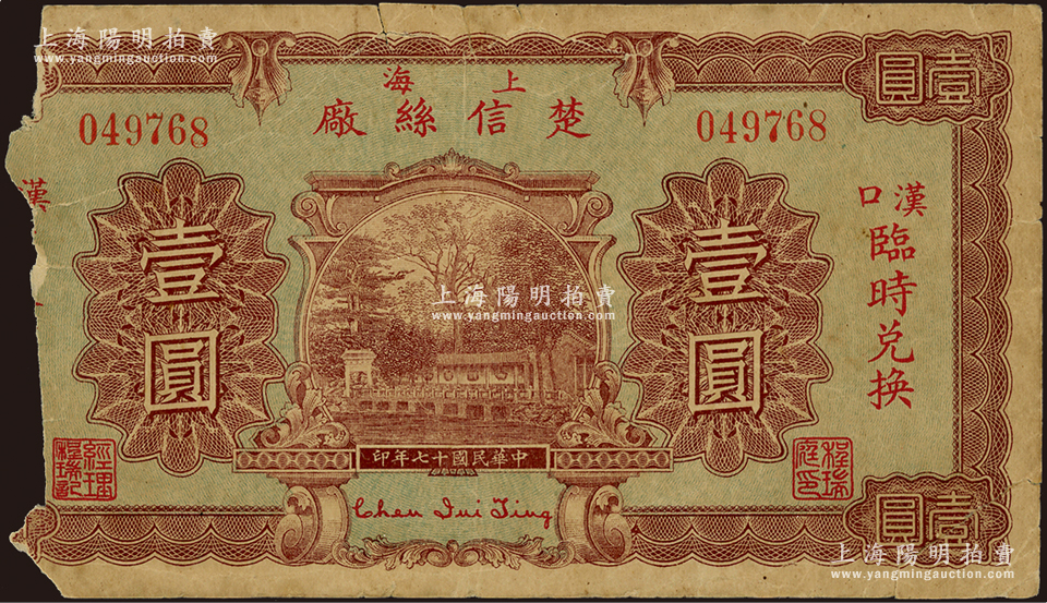 民国十七年(1928年)上海楚信丝厂壹圆,汉口临时兑换,背印双孔雀图与告白文字;少见品,唯惜左边已缺失,敬请预览