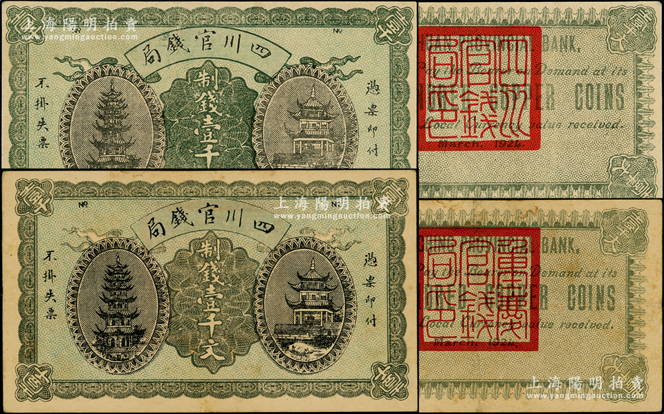 1924年四川官钱局制钱壹千文共2枚不同,详分:1枚背盖“四川官钱局印”,其英文名称以Ssuchuan开头;另1枚背盖“重庆官钱局印”,且英文名称以Chungching开头;其中“重庆官钱局”版,在1970年Ward D. Smith《中国纸币》一书第89页有记载,存世极为罕见;八至九成新,敬请预览和重视