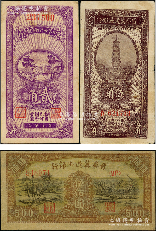 区票3种,详分:晋察冀边区银行1938年伍角、1946年赶驴与马耕地图伍佰圆;冀中第五行政区银钱局1939年贰角,背印“抗战建国”口号;八至八五成新,敬请预览