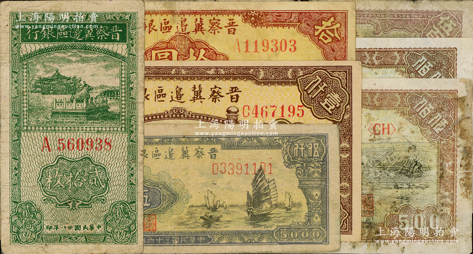 晋察冀边区银行纸币7枚,详分:1939年贰拾枚,1943年牧羊图拾圆,1946年赶骡与耕地伍佰圆2枚、牧牛图伍百圆、清河桥壹仟圆,1947年帆船图伍仟圆,约七至八成新,敬请预览