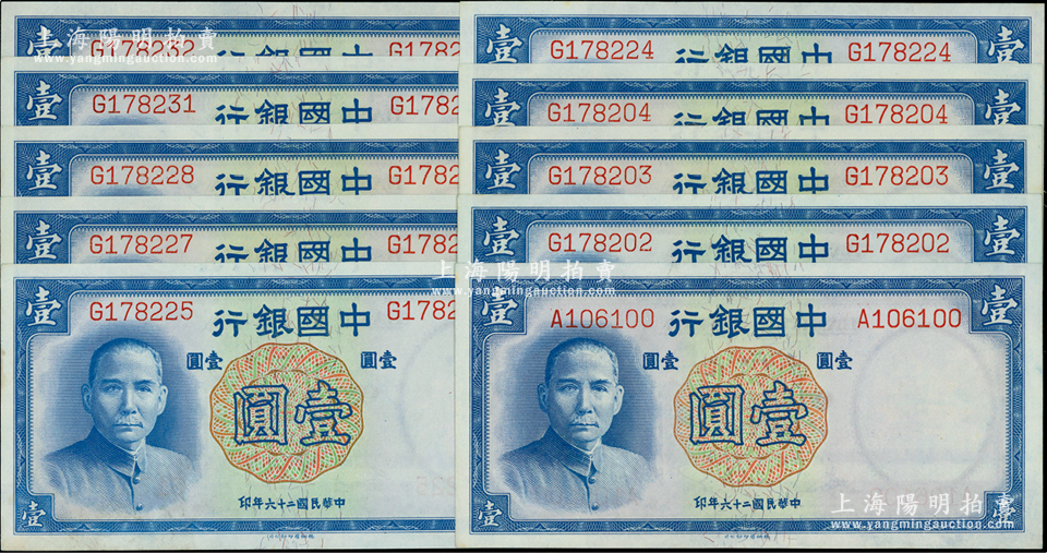 民国二十六年(1937年)中国银行德纳罗版壹圆共10枚,均为单字轨,部分连号,原票九五至九八成新