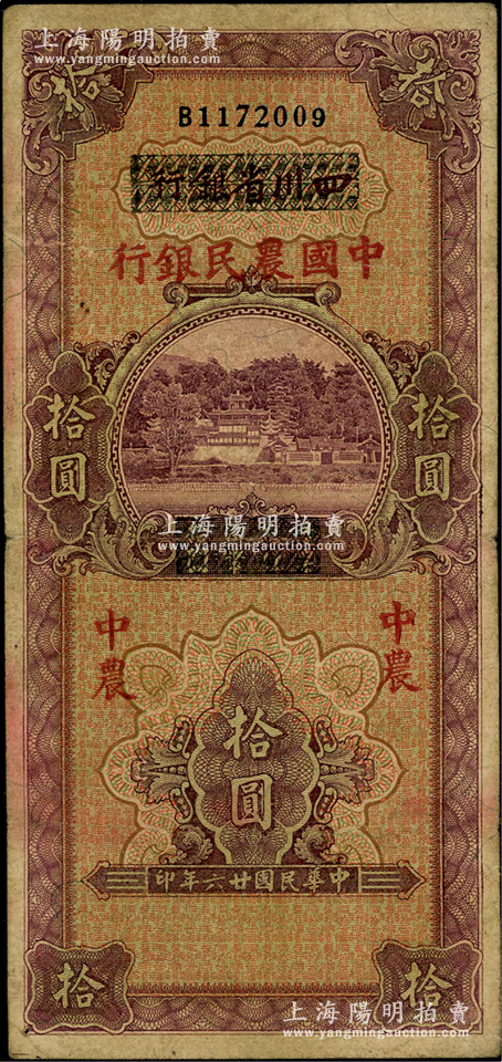 民国廿六年(1937年)四川省银行改中国农民银行拾圆,日本回流品,原票七五成新