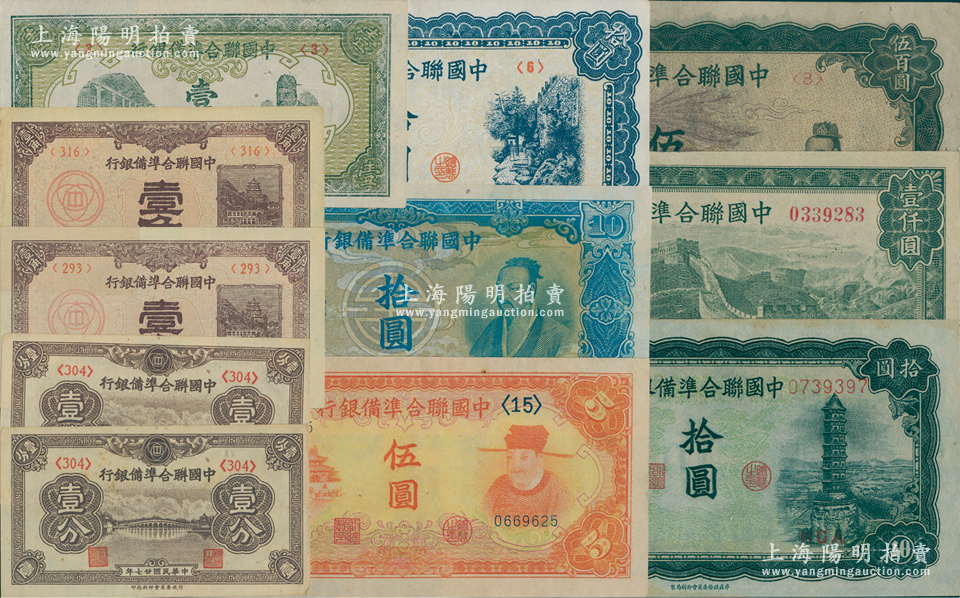 中国联合准备银行纸币11枚,详分:1938年壹分2枚、壹角2枚,1944年壹圆,左大殿右岳飞伍圆、左关羽右塔拾圆、蓝色左关羽右天下第一泉拾圆、蓝色尧帝拾圆、双凤图伍百圆、长城图壹仟圆;资深藏家出品,整体品相甚佳,约八五至九五成新,敬请预览