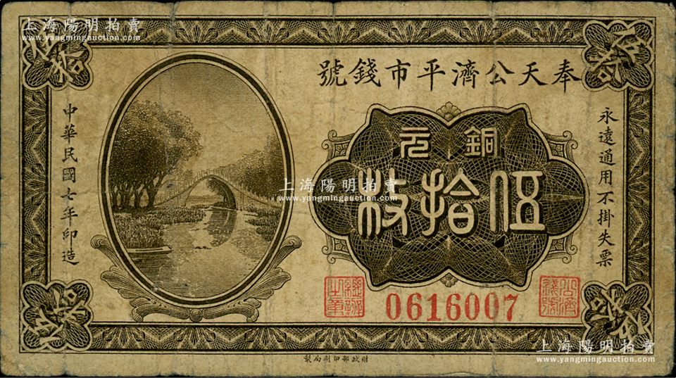 民国七年(1918年)奉天公济平市钱号铜元伍拾枚,上印颐和园玉带桥图(另1种版式为花纹图),少见品种,原票七成新