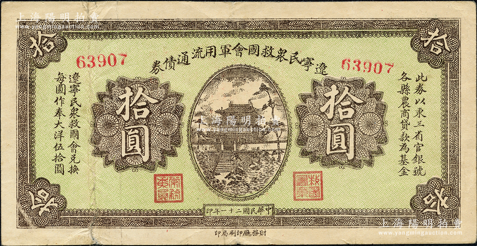 民国二十一年(1932年)辽宁民众救国会军用流通债券拾圆,5位数号码券,属东北义勇军唐聚五部发行,背面所盖辽宁救国会璧文字为诸葛亮之《后出师表》;日本回流品,七五成新