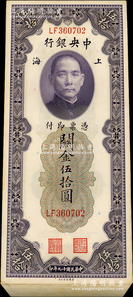 民国十九年(1930年)中央银行关金伍拾圆共96枚连号,属原封百枚缺第01、98至100号4枚,上海地名,LF字轨;资深藏家出品,上佳品相,九八至全新,敬请预览
